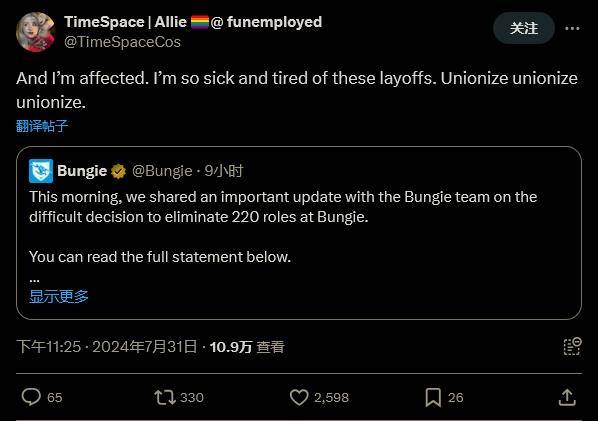 前 Bungie 商品部门员工 Allie 则表示:“我也受到了影响。我真的受不了这些裁员了。快建工会,快建工会,快建工会!”