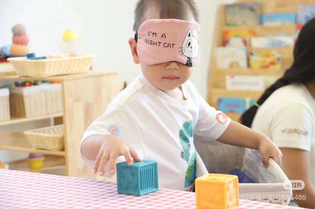 用眼罩遮挡住孩子眼睛后,在孩子四周放置不同物品。家长指定一种物品后,让孩子用双手触摸感到并找到对应物品。