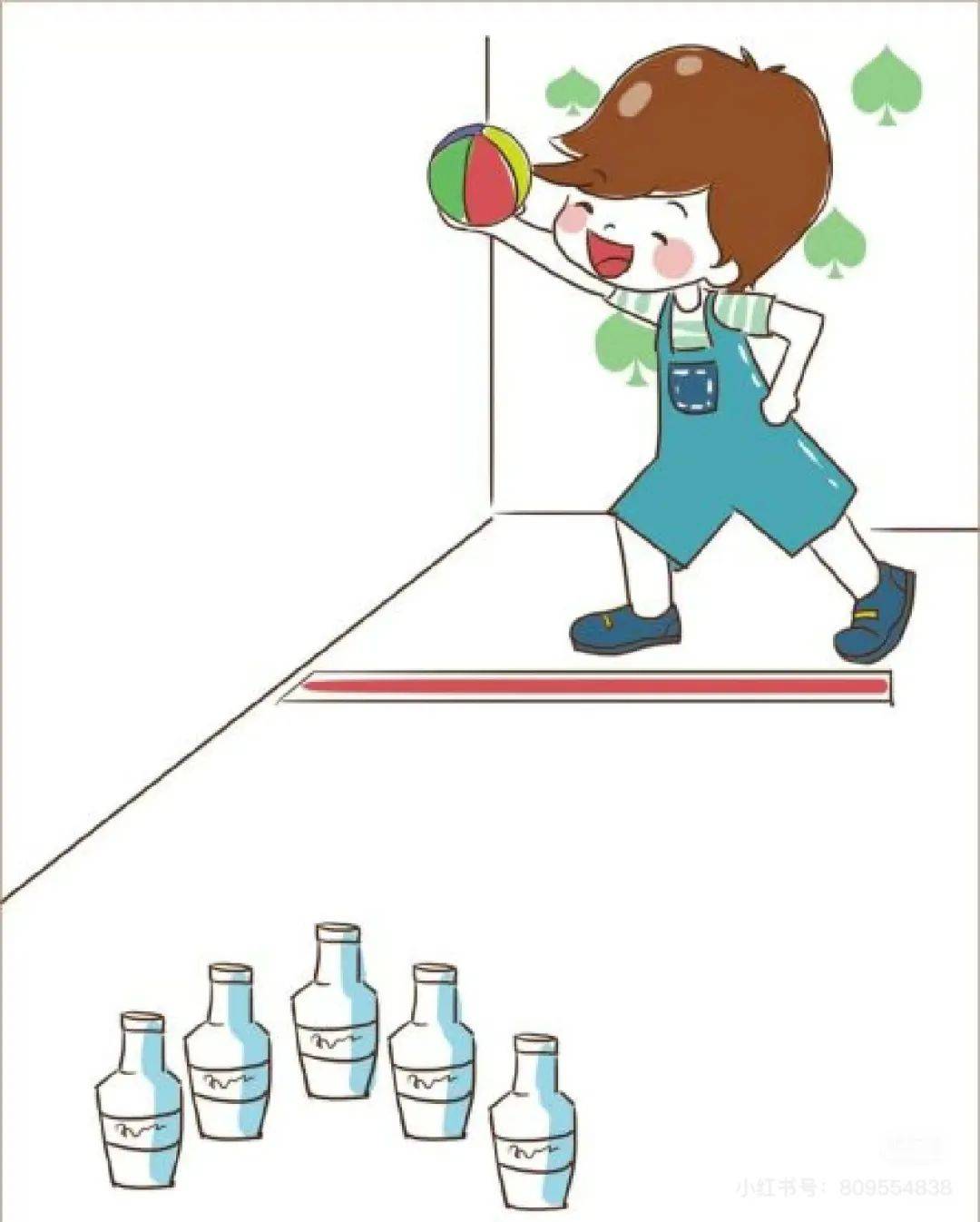 几个塑料水瓶、易拉罐摆放在地上,拿一球状物体即可进行家庭版保龄球大赛。