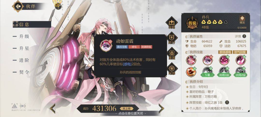 孙兵:开局招募必出角色,感电流核心人物。优势:2 星自带开局 100 怒气, 战策被动攻击减益目标可回怒,配合首充人物朱珠,推图可以连续放大,附加感 电真实伤害。