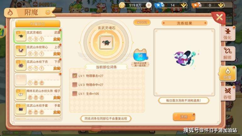附魔槽会根据人物等级逐步解锁,而且在洗炼过程中,会有保底,这点就很人性化。同时也可以使用高级洗练石可以使剩余保底次数不变。