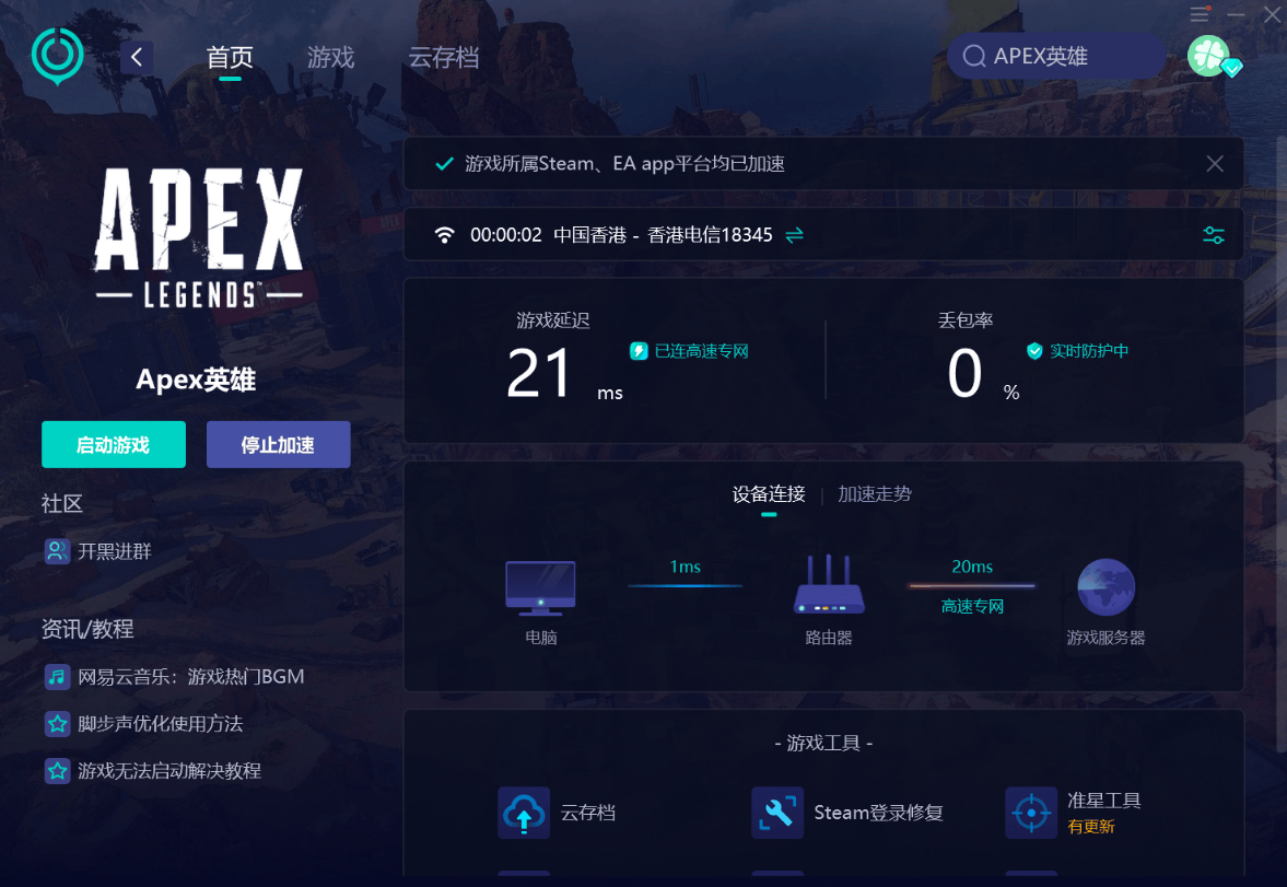 二:点击优化即可获得稳定网络连接,海外也能畅玩APEX22赛季