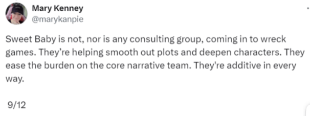 到此,我相信很多玩家会觉得有可能失眠组也是被绑架了才做了这些。可是当玩家指责声讨sbi时,第一个跳出来替它们说话的,就是失眠组的叙事总监Mary Kenney。她不仅认为sbi没有错,甚至还向大众传输是sbi的存在,才让他们的开发工作能够如此高效高质的完成。而且是连发12条推特来向玩家辩解。最后,还是被玩家喷到破防锁推收场。这种明显宁可自爆都要硬顶的架势,简直就像是领了“主人的任务”显然,它们是一伙的。