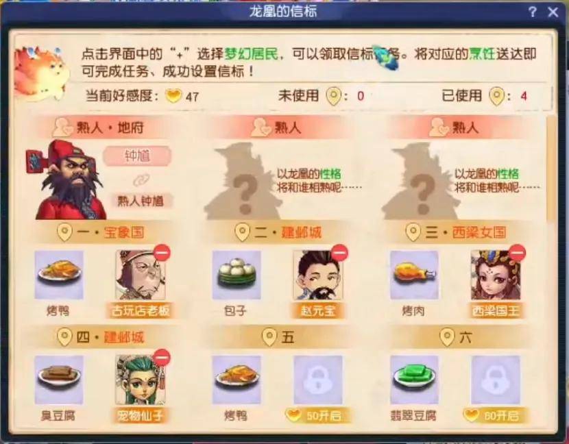 拥有龙凰后,在龙凰的信标界面里选择好对应的NPC并上交烹饪即可设定信标,之后在当前频道喊话:“龙凰,带我去找某某某”即可立刻传送至该名NPC附近。不过这项传送只能传送至“梦幻居民”NPC,像钟馗这种“熟人”NPC只会传送到最近的驿站。