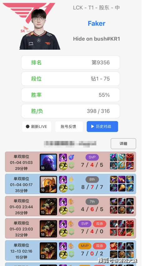 根据韩服排位统计,小程序显示,Faker在结束长达30天的行程后,终于登录韩服账号,连打四把排位,战绩1胜3负便迅速下线,这个画面本身就极具象征意义——并非状态崩塌,而是疲惫真实存在,长时间脱离系统训练,再加上频繁出差、作息不规律,即便是Faker,也难以做到“随时在线”。