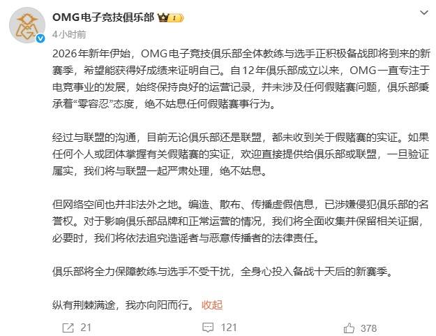而在今天,OMG战队也是针对涵艺的这波爆料给出了回应,发布了官方公告,内容也很简单,OMG战队并未涉及过任何假赌赛的问题,俱乐部秉承着对假赛零容忍的态度,绝对不会姑息任何假赌赛的赛事行为。
