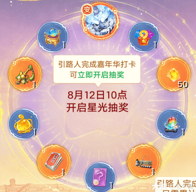 委托的引路人完成嘉年华线下打卡后即可在星光界面开启抽奖,最高奖励典藏变色年!