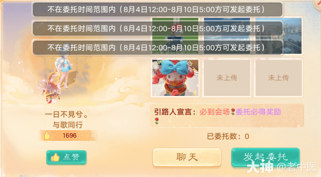 在引路人页面,点击列表中的引路人,点击“发起委托”即可成为委托人(8月4日12:00-8月10日5:00可发起委托)测试服目前已经能够委托了(2017、君临天下、情系今生、相聚长安、风生水起)
