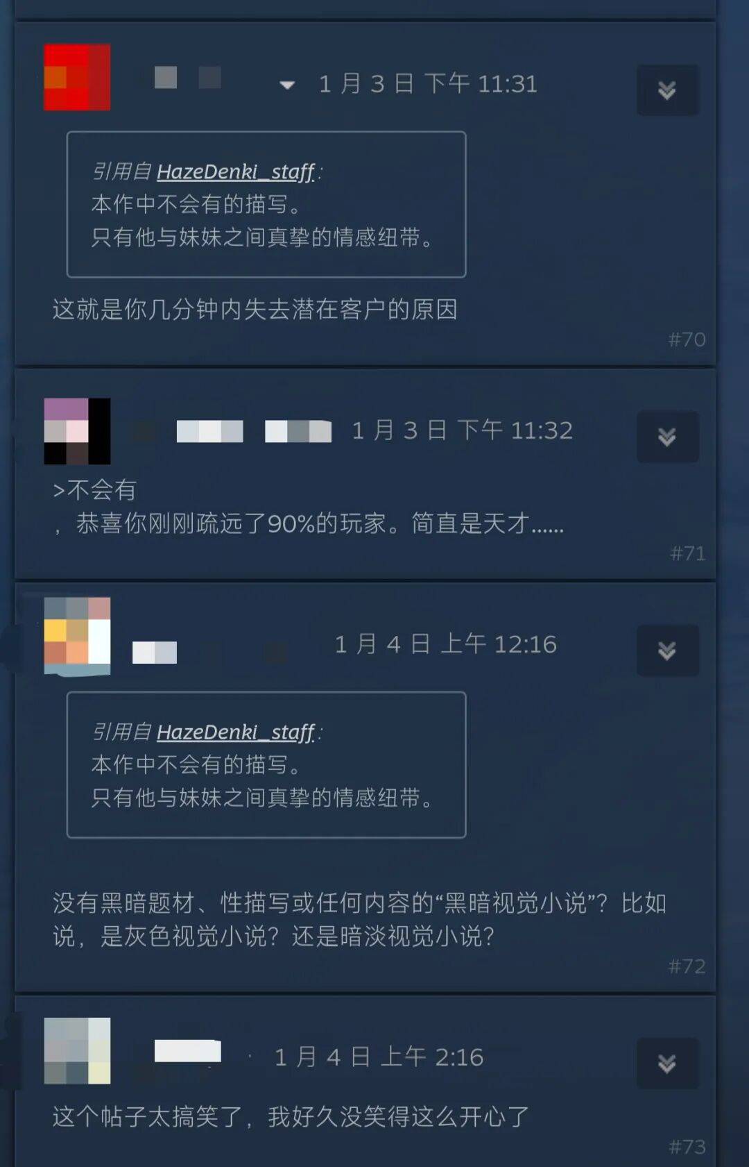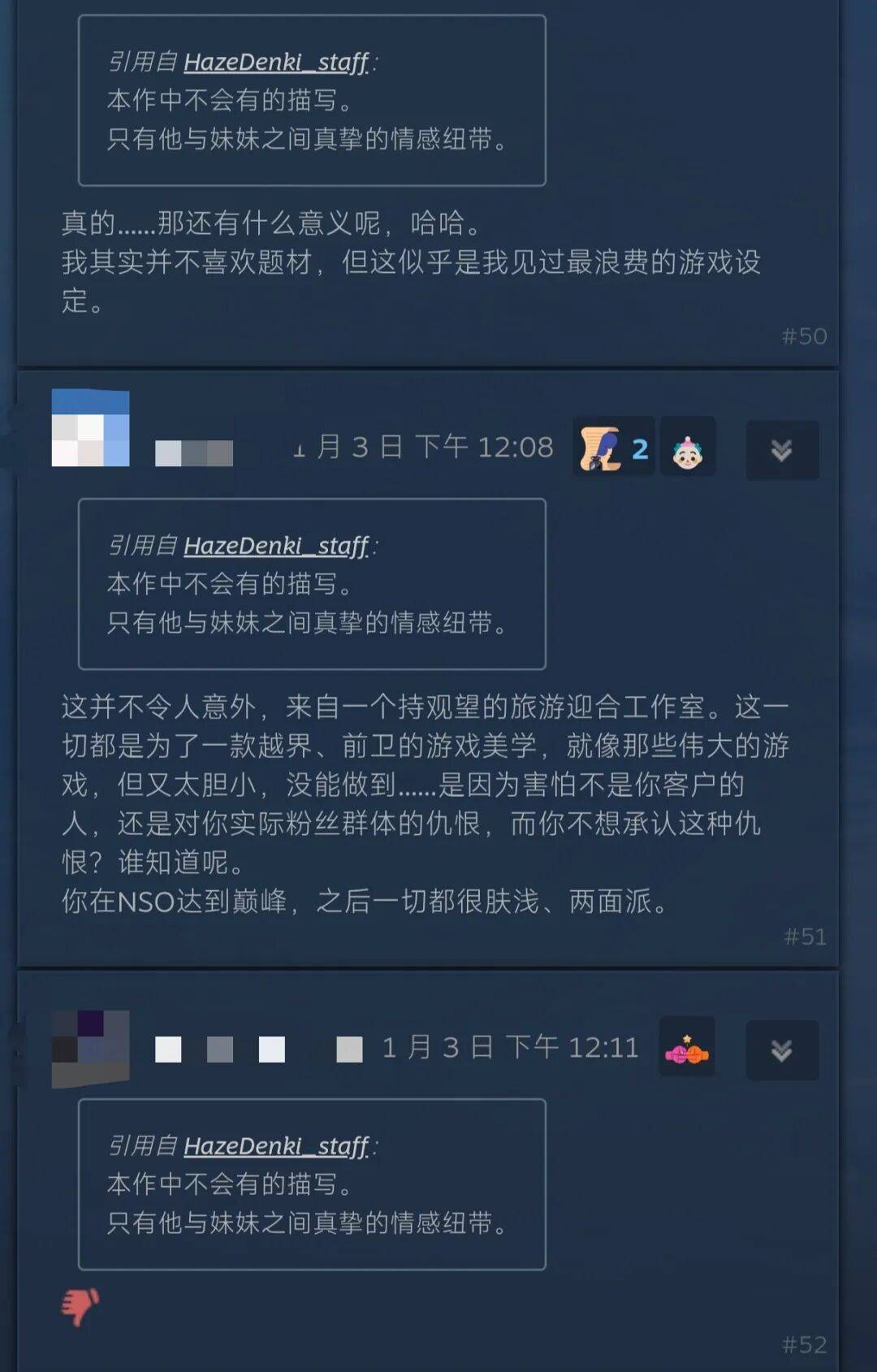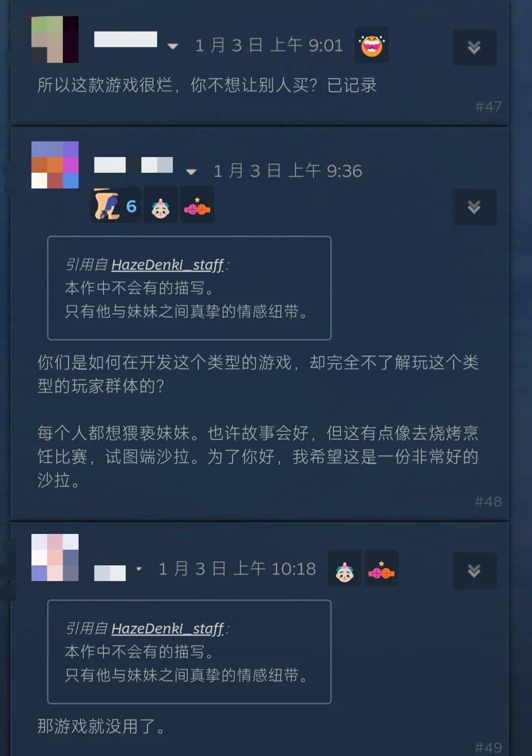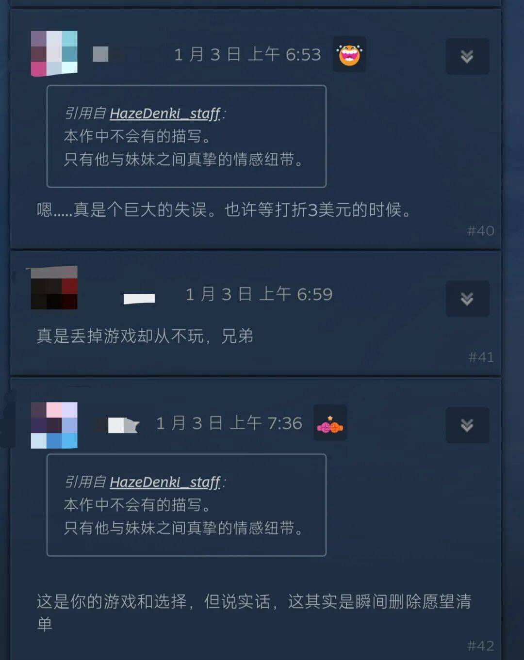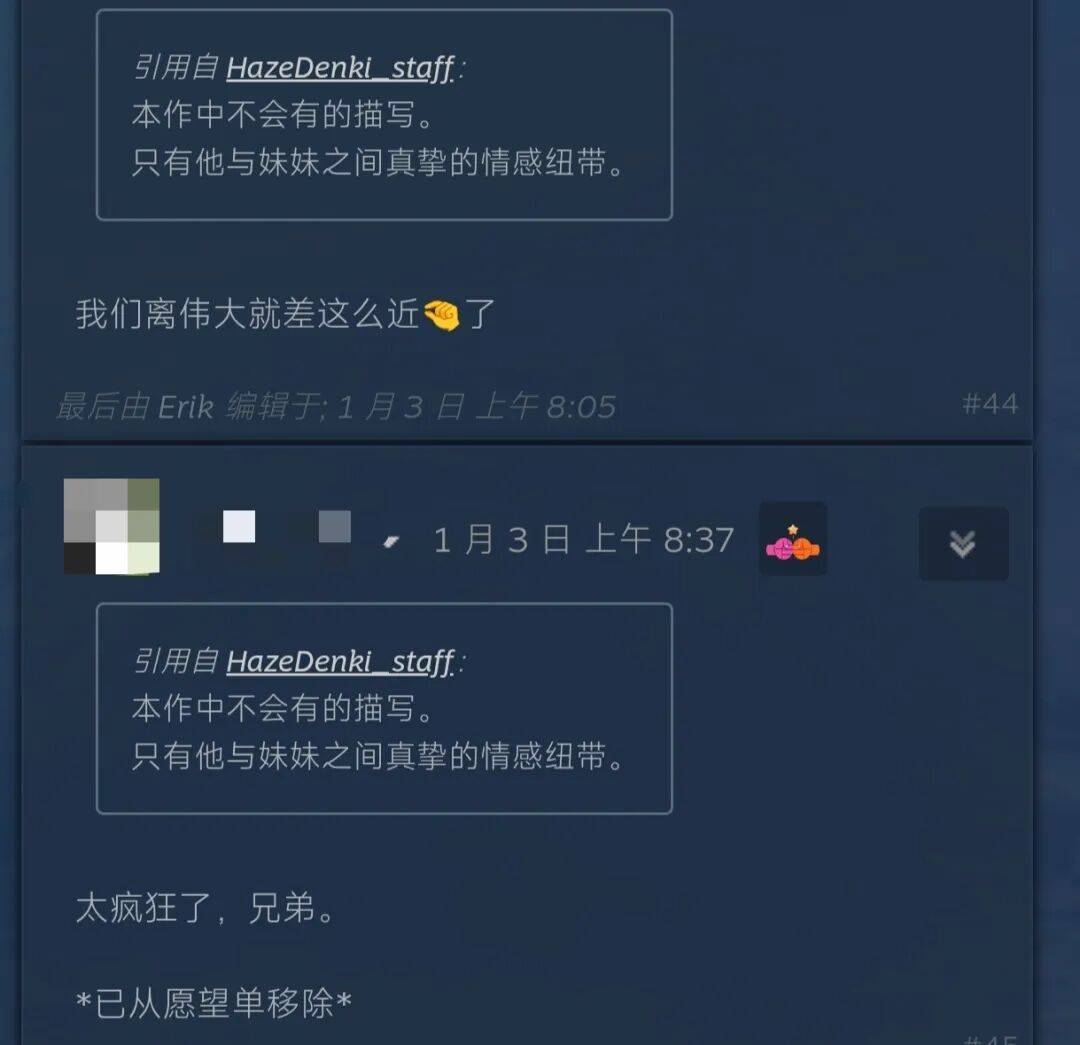 说实话,看到这里的确有种啼笑皆非的感觉——就像之前大枪苇人整的养女儿游戏没有R18导致很多人喊着不玩一样,下面的评论也有很多人喊着不玩并且取消愿望单。