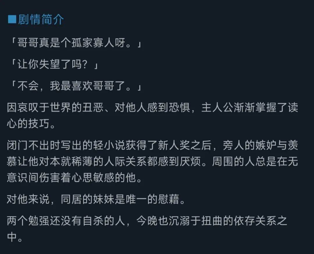 黑暗视觉小说,扭曲不健康依存关系,然而只有他和妹妹之间真挚的情感纽带。