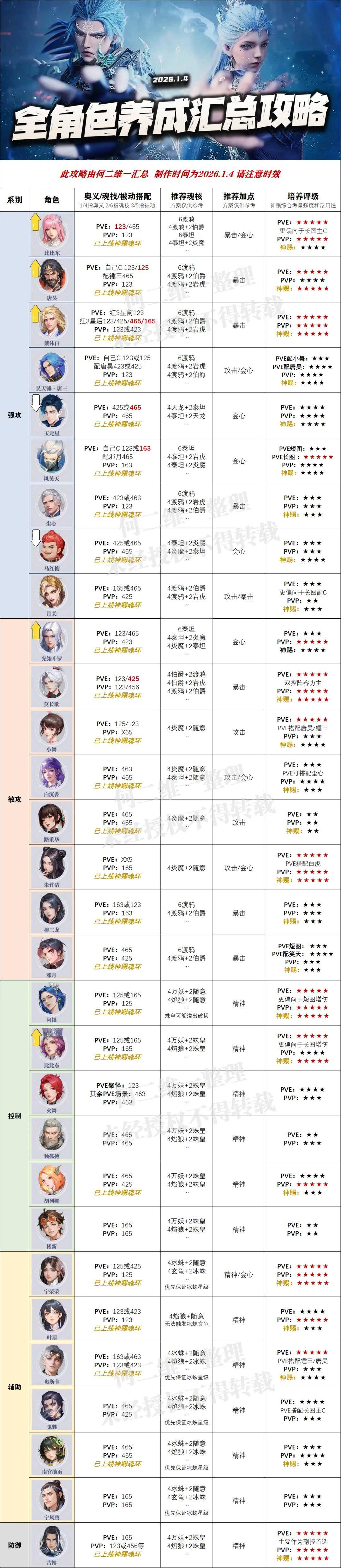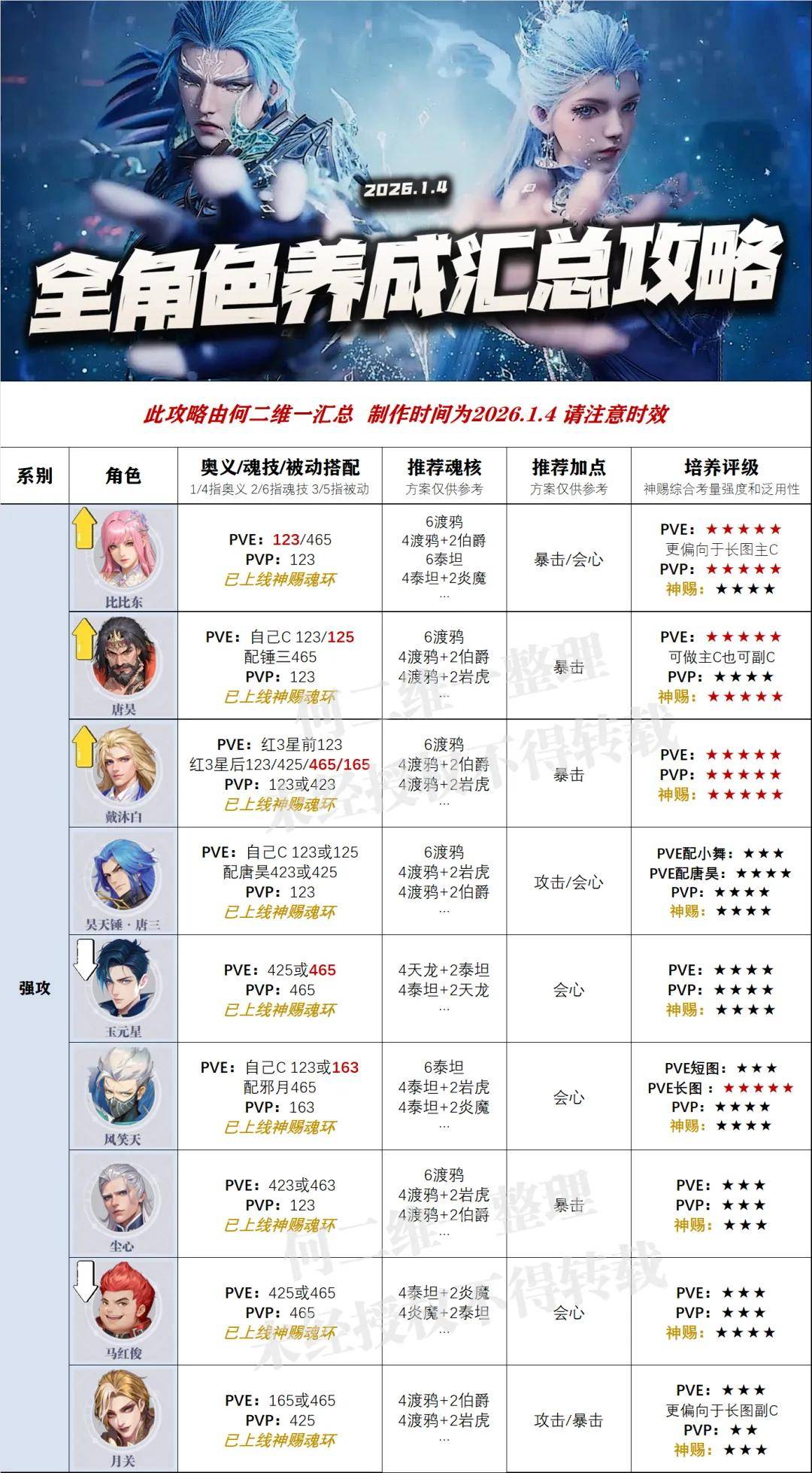 今天的攻略我们该来把最新版的全武魂强度评级与养成汇总攻略做个更新了,因为近期随着不少新角色的上线和新神赐魂环的上线,PVE的战斗格局早已出现了较大的变革,同时更大的变革则出现在PVP端,随着PVP新神光翎斗罗和噬魂比比东的上线,最强的PVP主C也随即发生了变化,不过还在维一写这篇攻略的时候便看到了官方于PVP中削弱光翎斗罗和噬魂比比东的公告,真是唏嘘不已,不过因为刚刚晚上才重度打了PVP竞技场,所以维一体感这两位的PVP强度依然在线,只是操作门槛稍微提高了一些,那接着咱们就一个一个开唠!