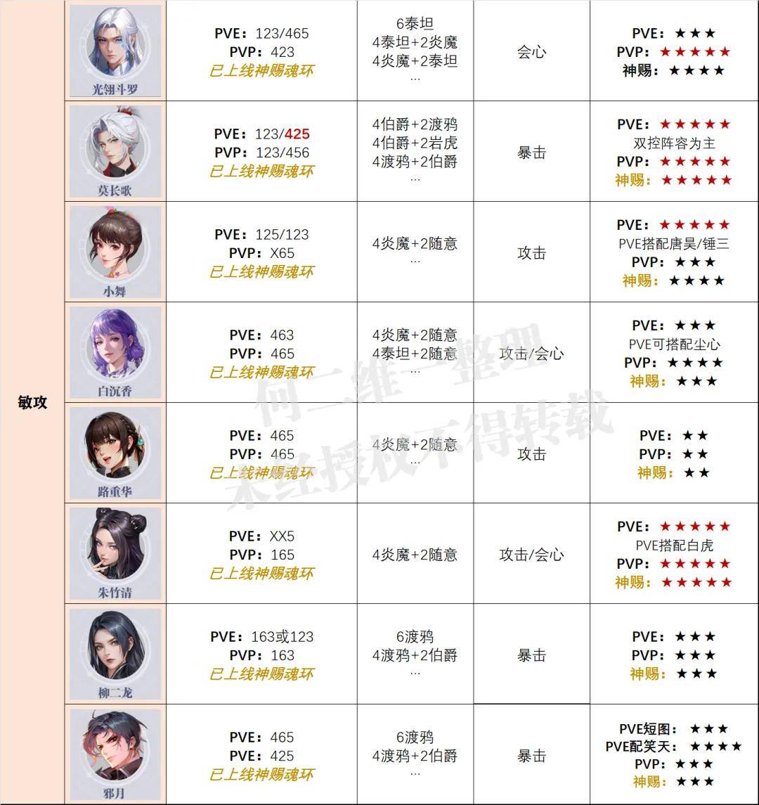 然后在敏攻系部分,此次的变化并不算很大,新加入的光翎斗罗PVE方面就不提了,这些个通行证魂师在PVE方面都不咋样,也算是个一脉相承的传统了,但这三位却在PVP端甚是恐怖,初代目通行证角色白沉香曾霸据PVP敏攻第一宝座长达数月之久,而二代目通行证角色叶原至今也是PVP第一辅助武魂,然后三代目通行证角色光翎斗罗的上线嘛则又一次证明了这个逻辑,其目前就是PVP中最强的敏攻系角色,没有之一,特别是那个还没削弱之前的恐怖核弹模样,不知道大家是否还有印象。
