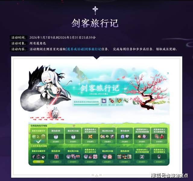 从今天开始至3月31日,玩家使用莲参与“剑客旅行记”活动,完成每周任务与步步高任务即可获得丰厚的成长资源,加速等级提升。同时,新版本对多项游戏系统进行了优化,让新老玩家都能轻松享受冒险乐趣。