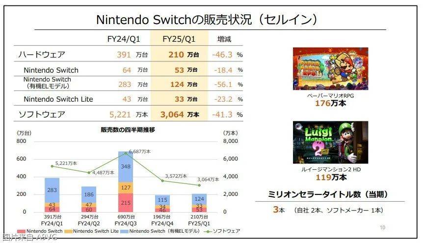 Switch硬件销量210万台同比减少46.3%、软件销量3064万同比减少41.3%。