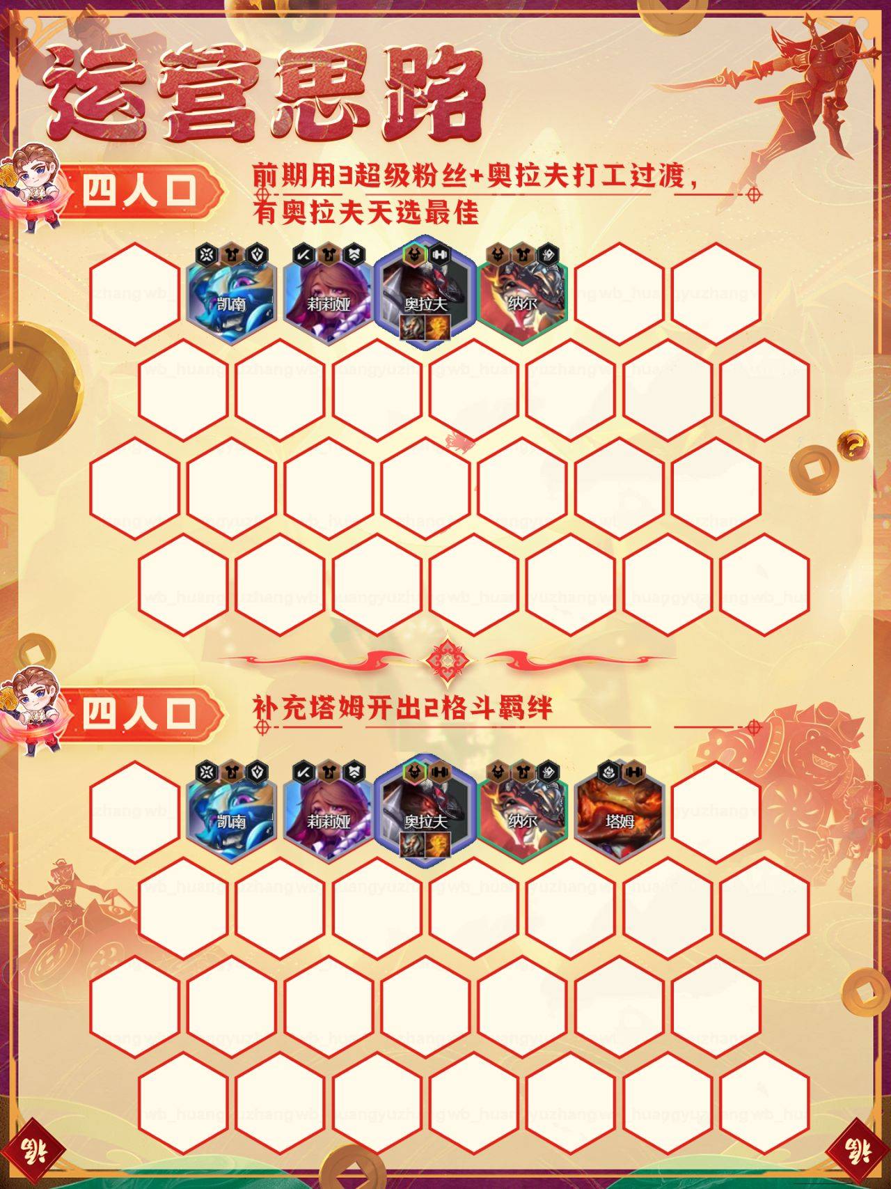 虽然这套阵容以3超级粉丝+奥拉夫打工过渡会最佳,中期补充五杀羁绊。