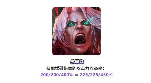 阵容强度:当前版本佛耶戈全等级提升了攻击力效率,1、2星佛耶戈的攻击力收益率提升了10%,之前版本佛耶戈的伤害已经很爆炸,现在强度更可观