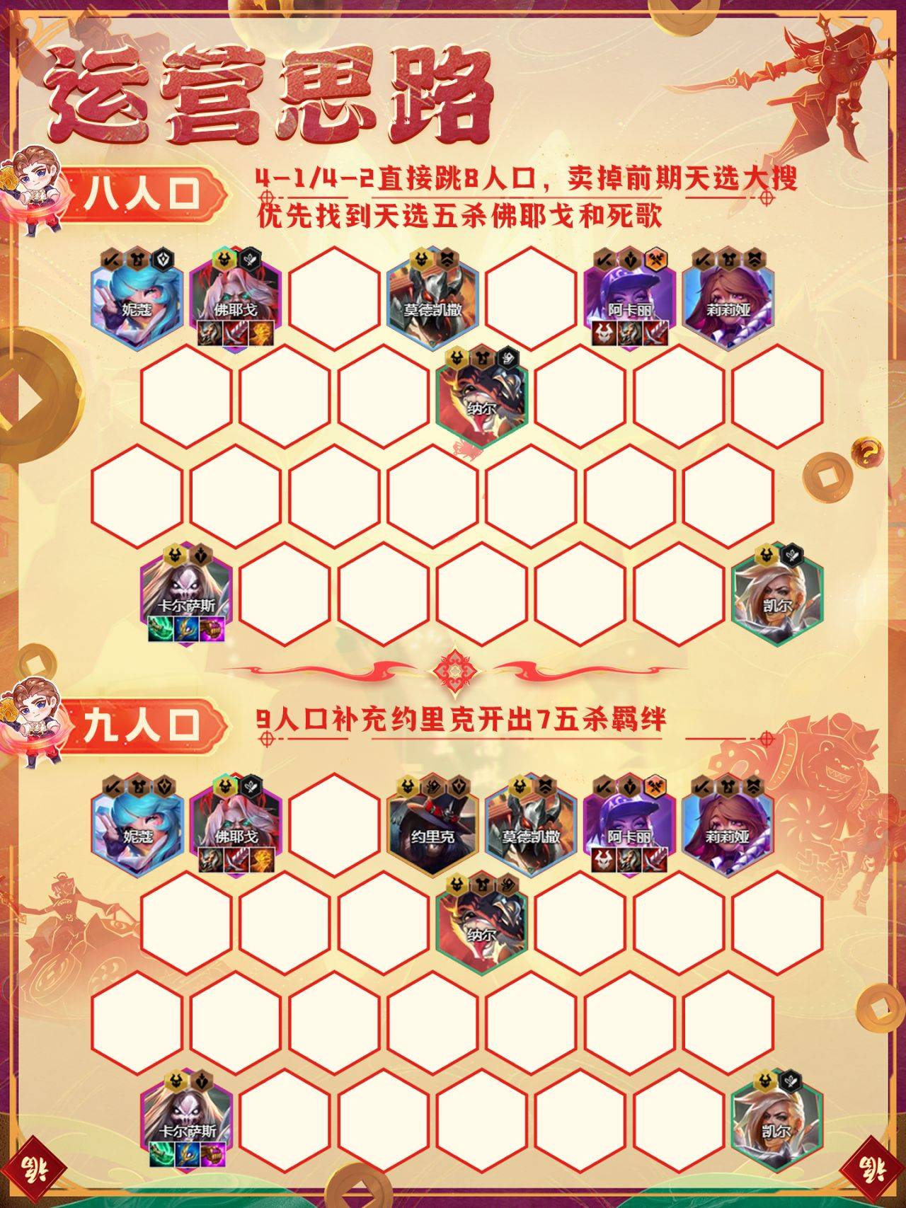 9人口优先补充约里克开出7五杀羁绊,后期可以考虑下掉铁男补充俄洛伊、奇亚娜、娑娜等2星5费卡