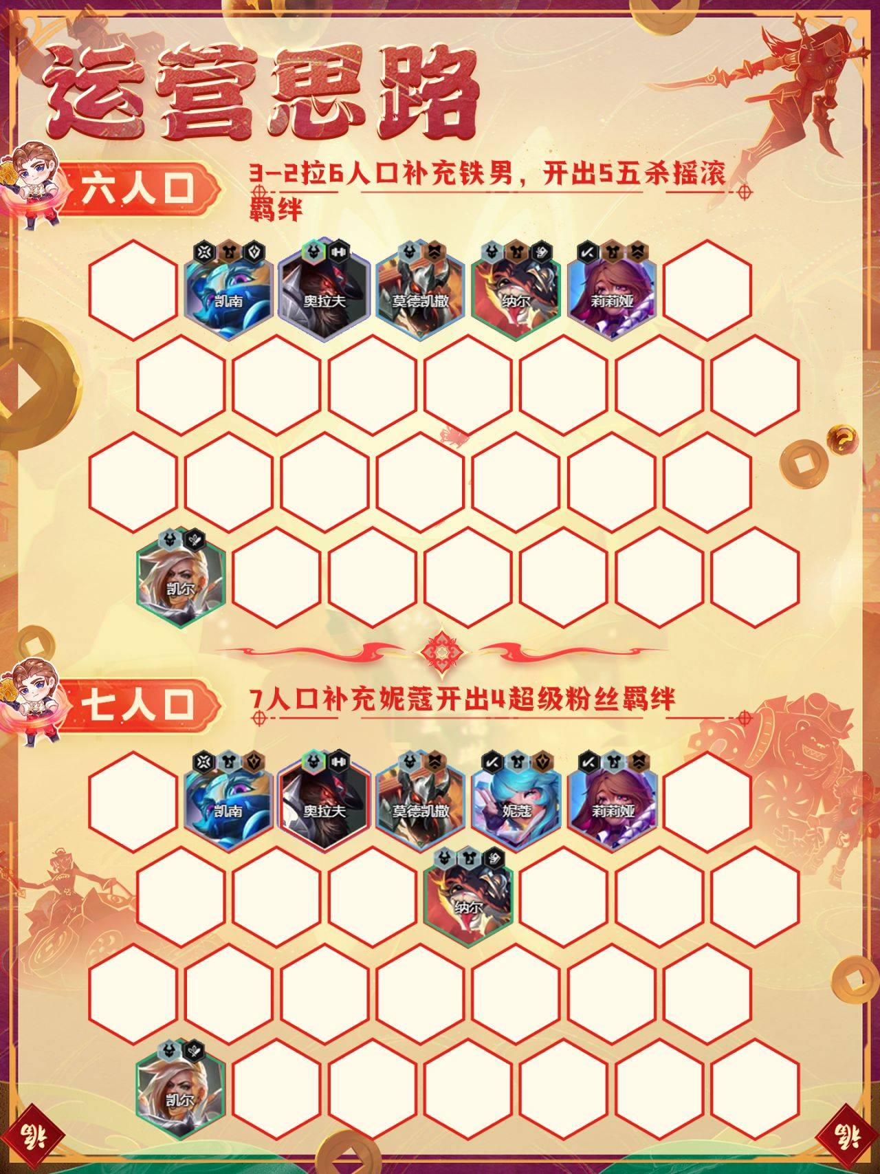 3-2拉6人口补充铁男,如果有五杀天选直接开出5五杀摇滚羁绊,这个强度基本可以保证3阶段的连胜