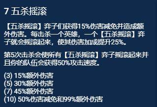 五杀羁绊的效果是每次击杀一个英雄,五杀弈子就能够获得额外25%的伤害加成,其次第五次击杀后能够获得50%攻速加成。因此死歌的第一个技能的击杀对于五杀羁绊的启动非常重要!