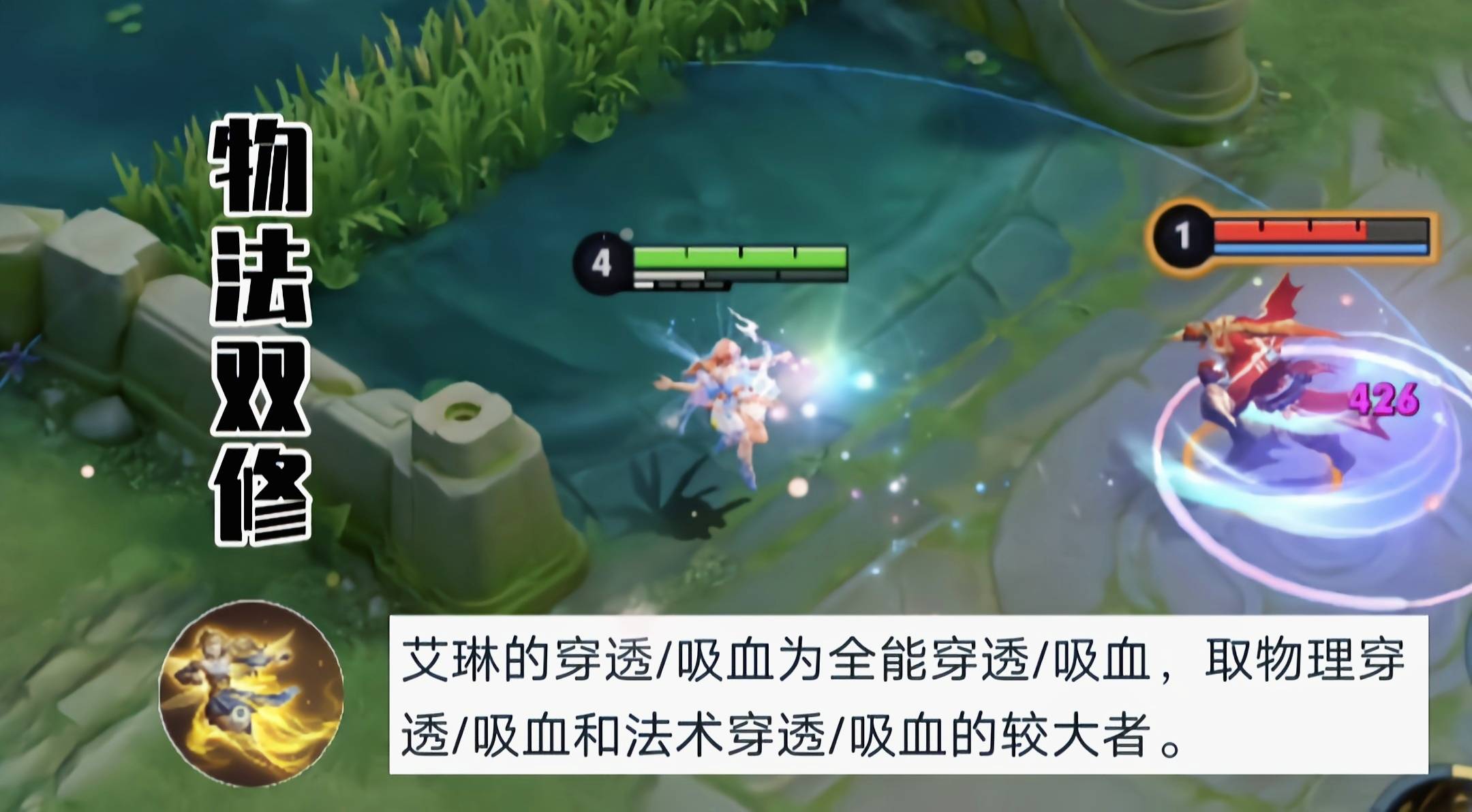艾琳的输出方式比较特别,可以根据属性的高低,而采用不同的属性增益,例如穿透,吸血,都是参照属性中比较高的一方面,物理穿透高,按照物理穿透计算,法术穿透高,则按照法术穿透计算,因此在属性增益上,艾琳可以进行混搭的方式。