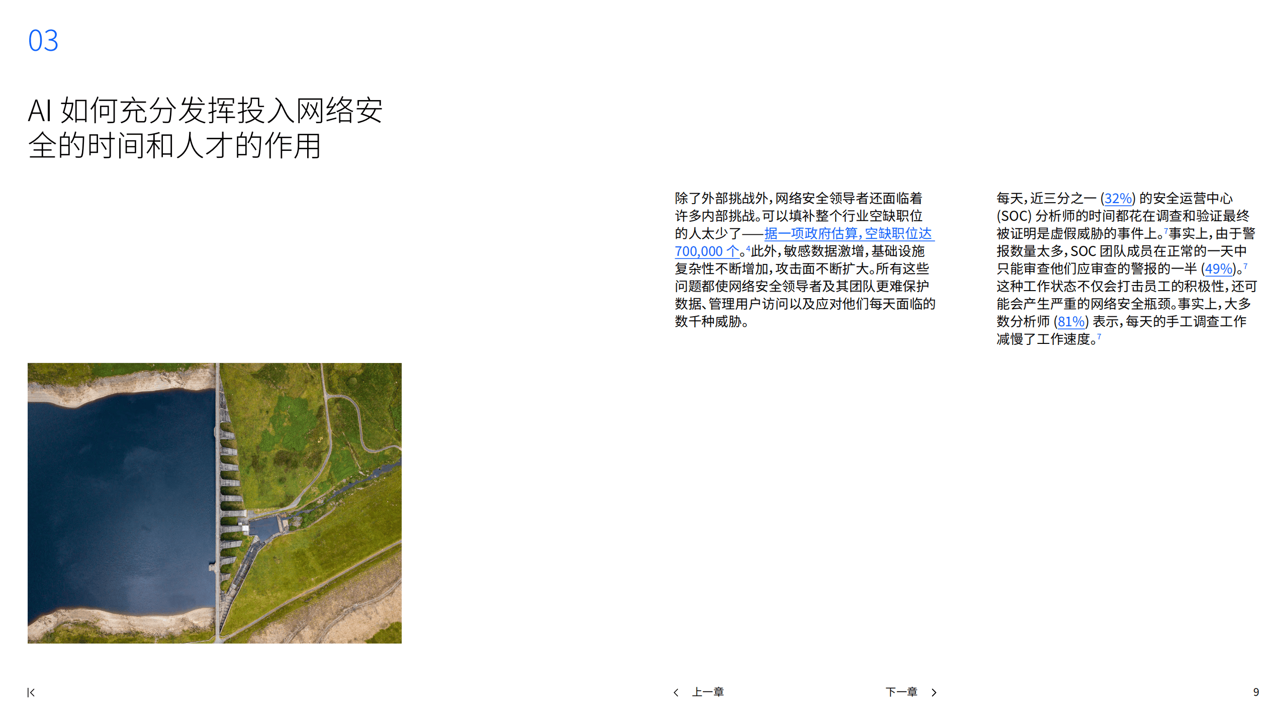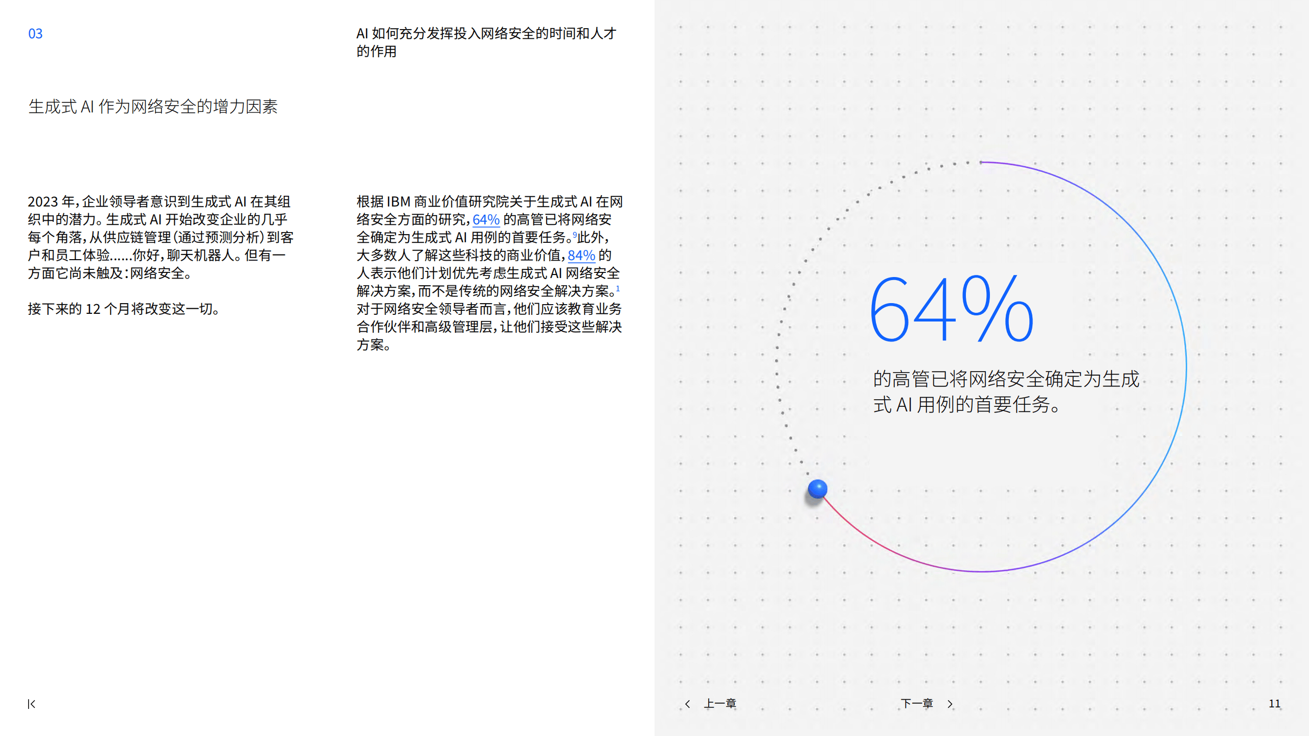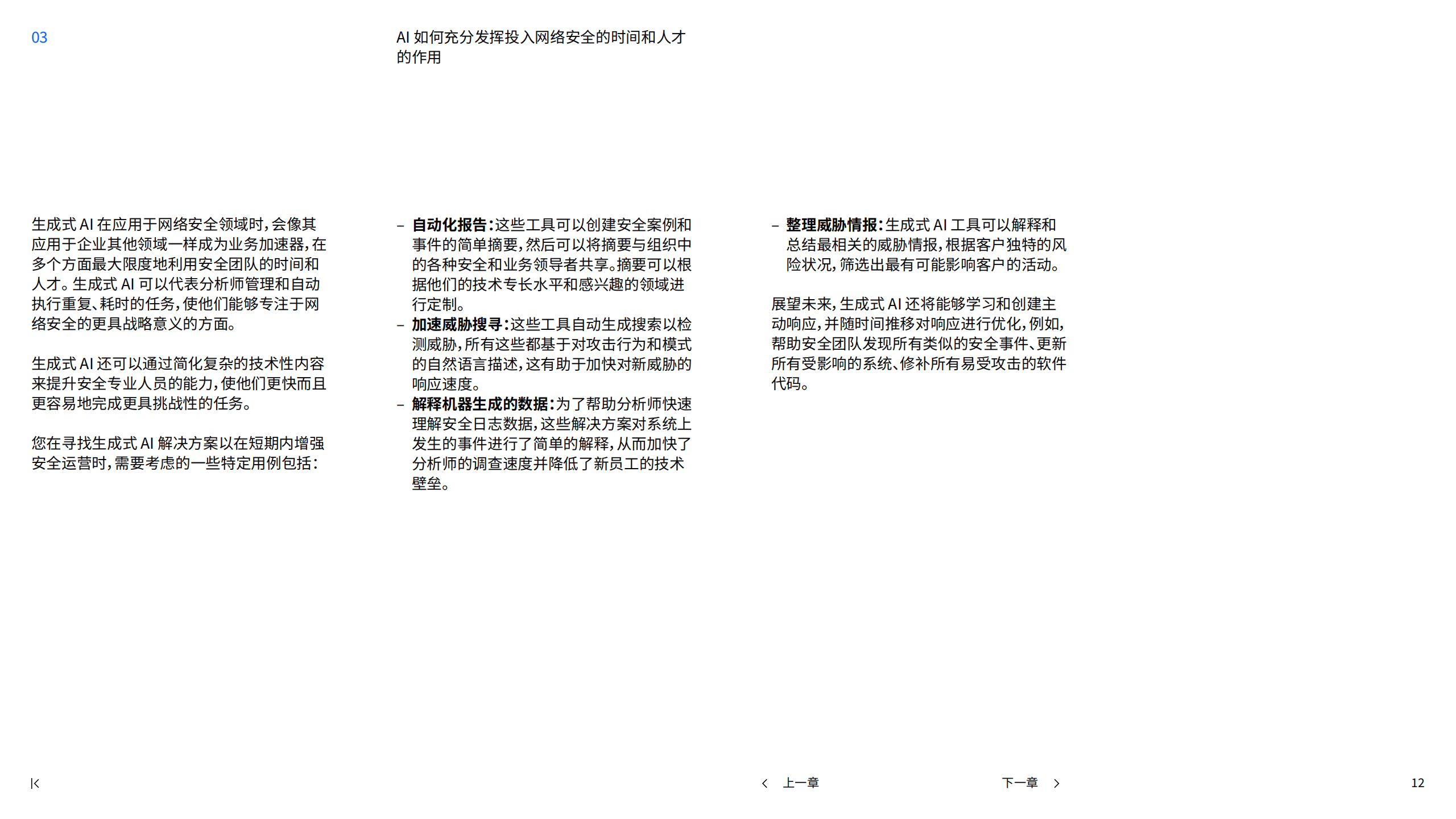 网络安全领导者面临人手和技能短缺、敏感数据激增、基础设施复杂性增加和攻击面扩大等内部挑战,导致SOC分析师时间浪费和工作效率低下。传统AI解决方案使用机器学习帮助评估风险和推荐应对措施,具有缩短发现和遏制泄露时间、监控网络通信和节省成本等优点。生成式AI将改变这一局面,64%的高管已将网络安全确定为生成式AI用例的首要任务,84%的人计划优先考虑生成式AI网络安全解决方案。生成式AI可代表分析师管理和执行任务,提升安全专业人员能力,具体用例包括自动化报告、加速威胁搜寻、解释机器生成的数据和整理威胁情报等,未来还将能够学习和创建主动响应并优化。