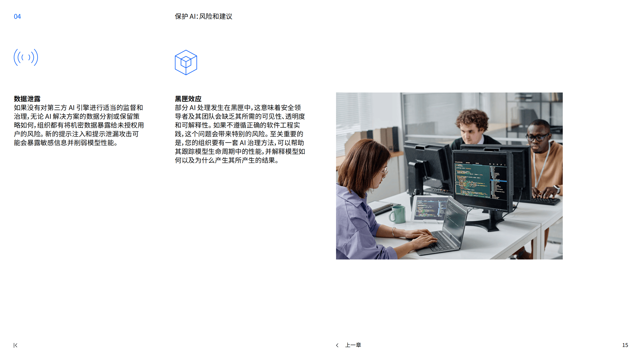 - 黑匣效应:部分AI处理发生在黑匣中,缺乏可见性、透明度和可解释性,组织应建立AI治理方法,跟踪模型生命周期中的性能并解释模型结果。