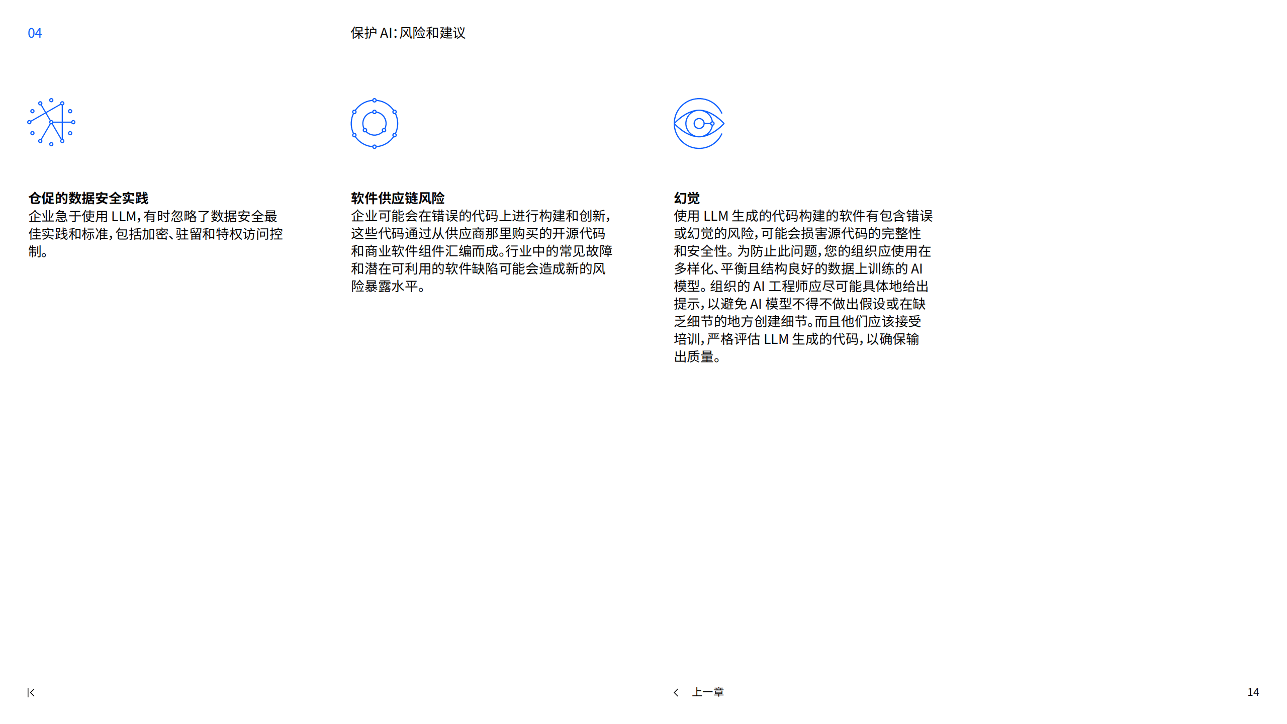 - 幻觉:使用语言模型生成的代码构建的软件可能包含错误或幻觉,损害源代码的完整性和安全性,应使用在多样化、平衡且结构良好的数据上训练的AI模型,给出具体提示并严格评估代码输出质量。