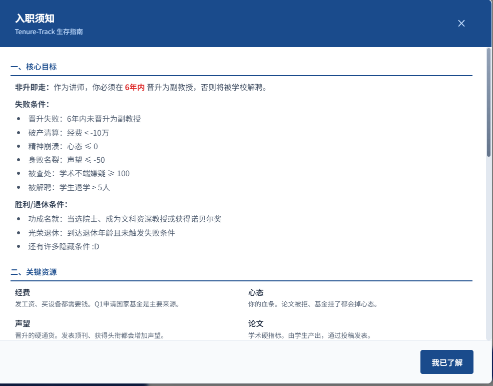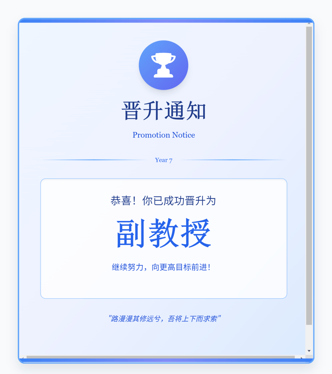 从构思到搭建完网页,两人只花了两周。初版其实很粗糙:没有严格的数值约束,科研经费多得花不完,连论文压力都没有。即便如此,游戏也让首批20位测试者玩得上头。他们的师姐刘亚慧就是其中之一,从晚上6点多玩到凌晨1点半,一路从“讲师”升到“院士”,直呼“成就感拉满”。后来师姐更是义务加入他们,帮忙运营起社交媒体平台。