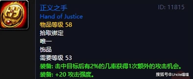 对于黑石深渊的正义之手,喵叔至今都没有弄明白一件事情,那就是到底什么时候他是将军掉落,又是在什么阶段他是索瑞森大帝掉落,有没有脑回路清晰一点的大兄弟来给喵叔捋顺了。对于这款饰品,不仅仅实用性非常强,对于脸黑或者排骨点的玩家,他的使用周期也是非常长,毕竟20点常驻攻击强度和被动的额外攻击收益都很稳定,当然喵叔感觉一般能够正常去黑石深渊刷到的玩家,还是少的,反正喵叔怀旧服战士是找人给带的,运气还是不错的,没几次就给拿下了。