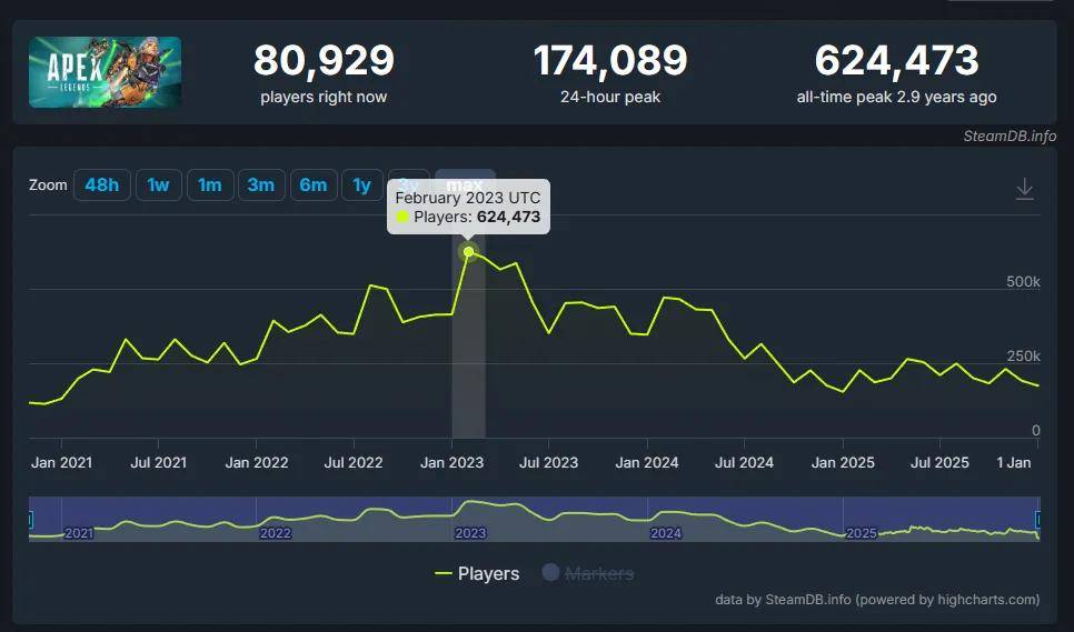 根据SteamDB数据,派派《APEX》每日在线人数终于止住了2024年以来的灾难下滑,维持在20万上下。