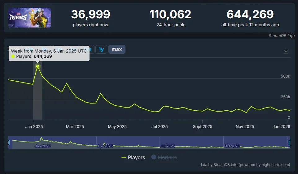 国产之光《漫威:争锋》在年初开服时有着和《APEX》巅峰时期相同的64万峰值,经过半年的震荡,在2025的下半年里维持在10-15万左右的常驻人口。