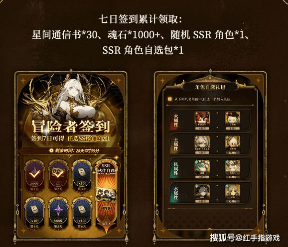 七日签到累计领取:星间通信书*30、魂石*1000+、随机 SSR 角色*1、SSR 角色自选包*1