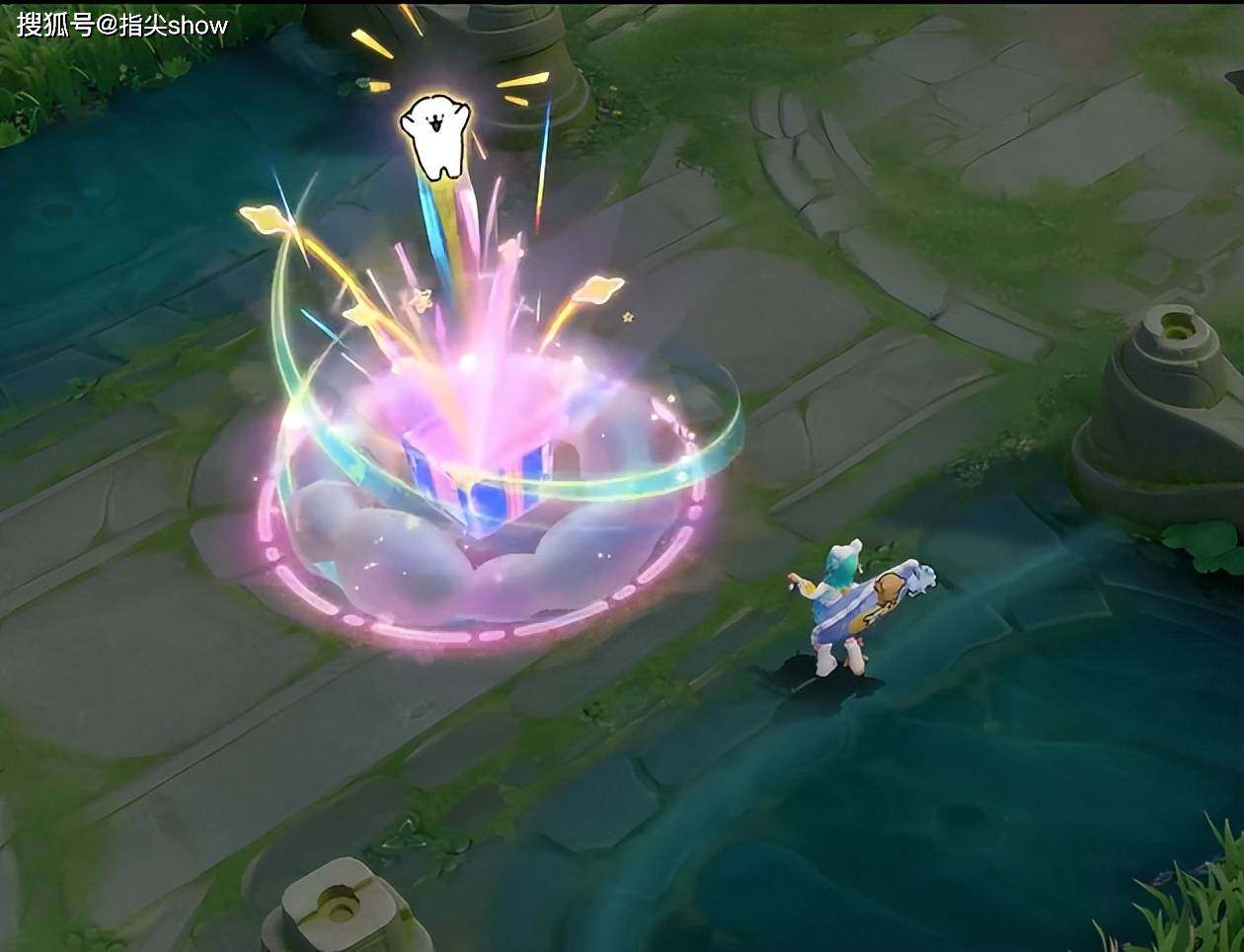 二技能目标脚下出现一个礼盒,崩开之后线条小狗从礼盒中跳出来,周围还环绕着梦幻般的云彩和彩带,就像收到了一个非常可爱的礼物,比较暖心。