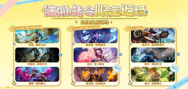 S42战令币兑换商店将返场9款皮肤,分别是亚连、高渐离、老夫子、廉颇的史诗级战令皮肤;孙悟空、妲己、墨子的勇者级战令皮肤;以及高渐离和妲己的战令星元。