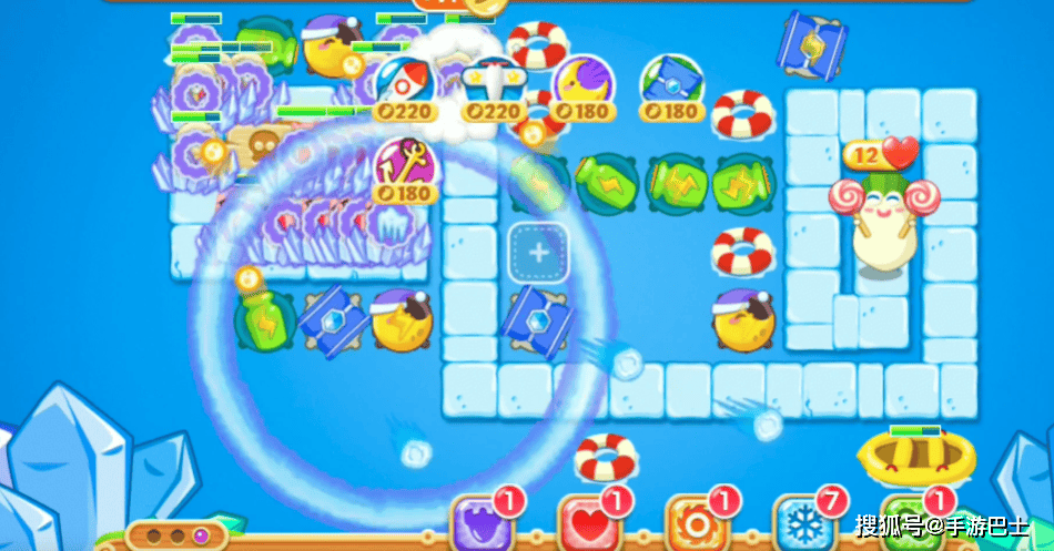开局至关重要,首先建议暂停游戏,快速记下地图中隐藏瓶子炮的大致位置,因为额外任务要求240秒内找到10个藏在道具中的瓶子炮,时间紧张,提前预判能避免手忙脚乱。恢复游戏后,优先在萝卜上方或怪物出口附近布置1个冰锤塔,一方面冰锤塔的范围伤害能快速清理周围的道具(比如鸭子造型的障碍物),另一方面可同步推进“用冰锤塔消灭220个怪物”的任务。清理道具时重点瞄准带有隐藏标识的目标,打出瓶子炮后立即升级,同时逐步清除剩余障碍物,解锁更多炮塔摆放位置,此时可补装1-2个冰锤塔,强化清怪和道具清理效率。