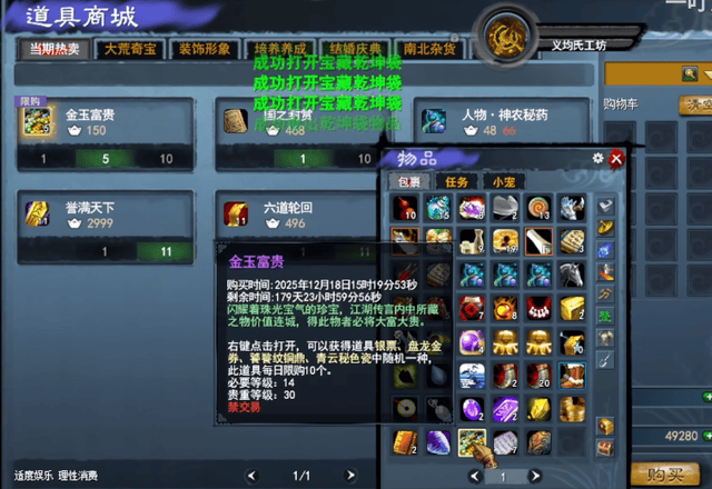 当然,想博一博单车变摩托的,也有高风险高回报的玩法。比如搞一堆号,每个人充个10块钱的首充,领了绑定金和能交易的五行盘、炼化石,这就有了启动资金。然后每天去开“金玉富贵”,这可是经典版里金币的主要来源之一。