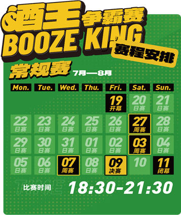 本届酒王争霸赛以“为自己干杯”的主题,除周赛和决赛外,每日18:30-21:30举办日赛,日赛成绩优异者可进入周赛比拼。