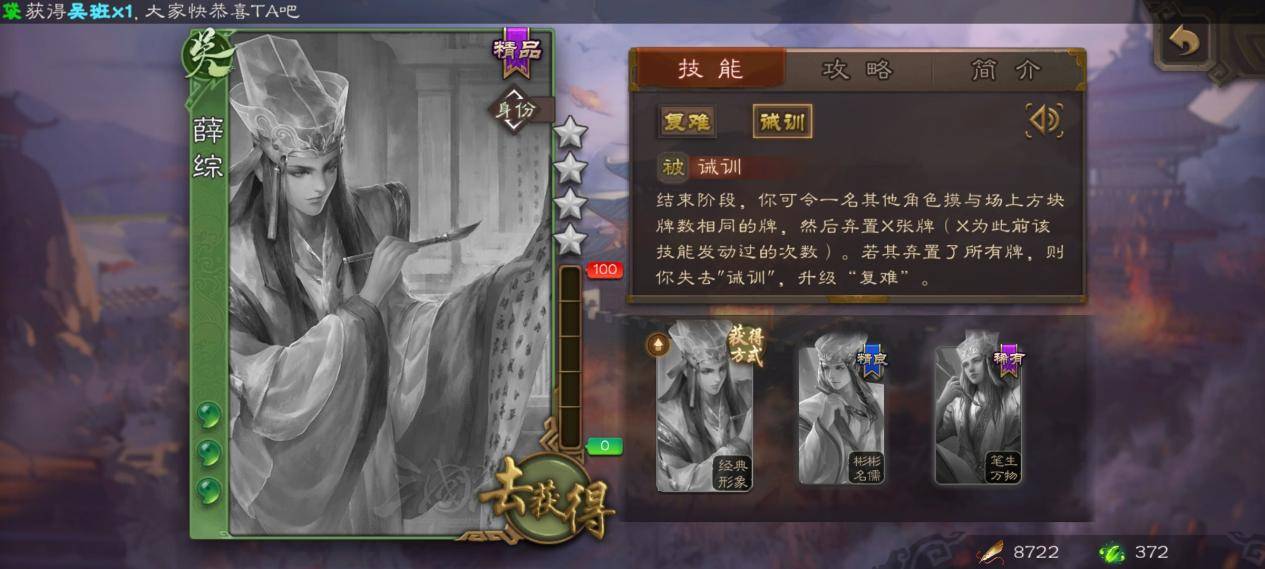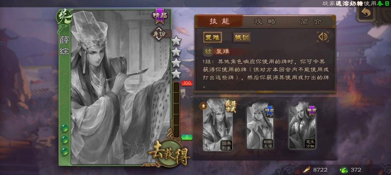 不得不说薛综这个武将的机制还是相当有意思的,他的核心点就是前期辅助队友给牌,后期定向大量拆牌。但技能的收益波动较大,并且觉醒之后会失去一个技能就很难受,如果不会在升级之后失去技能的话,那薛综绝对是精品将当中T1级别的存在,以当时那个版本来看这个武将的强度把握的很好,但在现版本当中多少有点鸡肋。