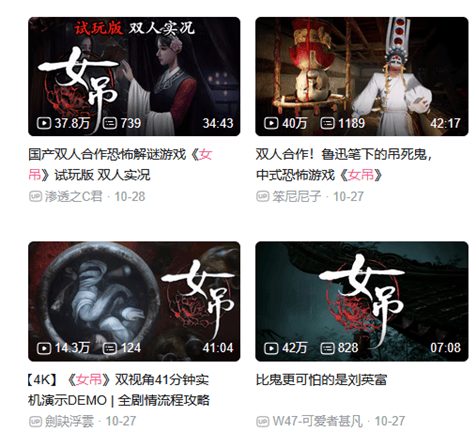 在B站,也已经出现了数个播放量达到几十万的《女吊》相关试玩视频,社区讨论度可见一斑。并且有趣的是,《女吊》在题材高度本土化、Demo试玩并未做其他语种本地化的情况下,仍有一部分声量来自于海外玩家社区。