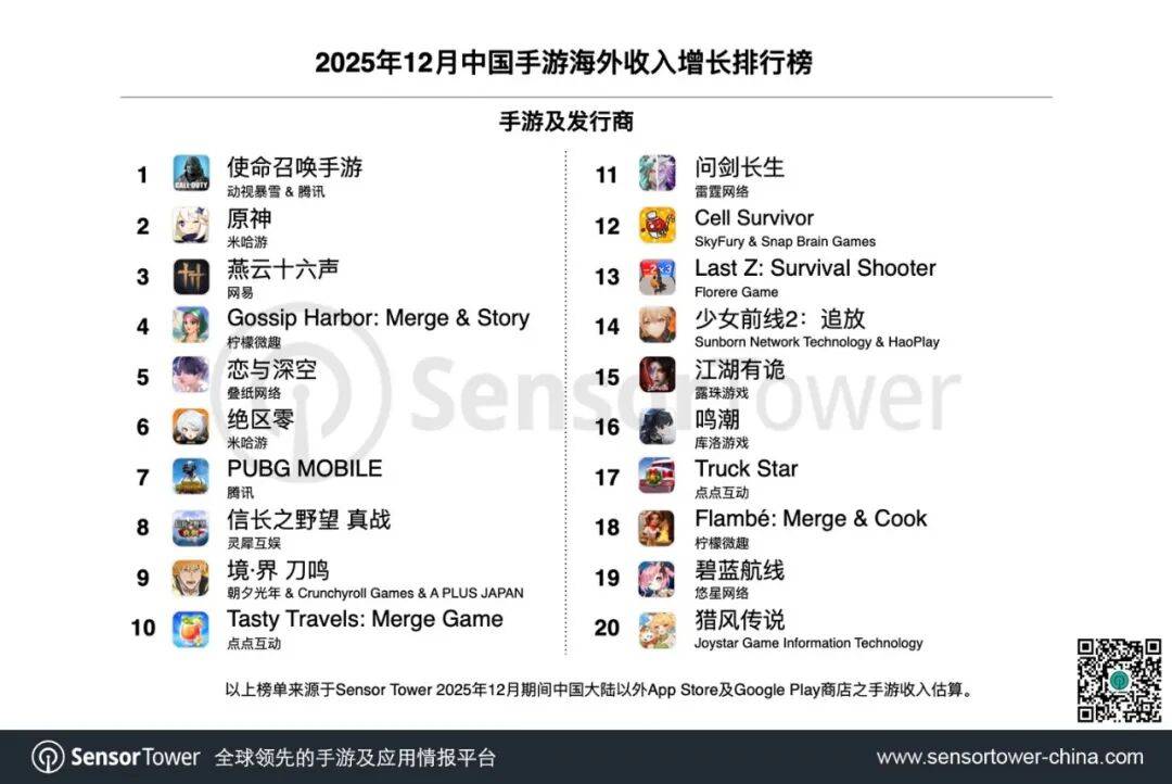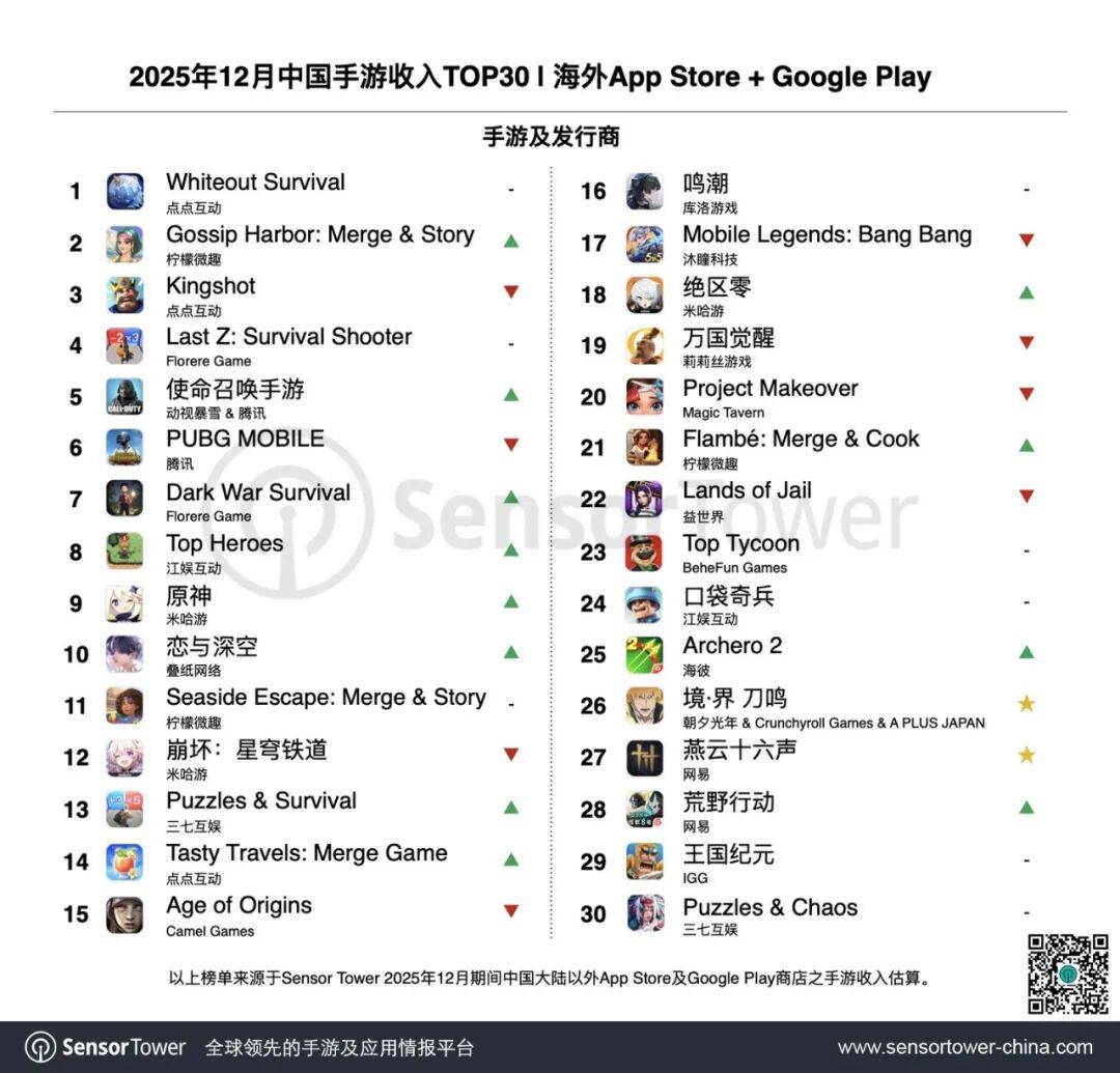 1月7日,Sensor Tower公布了12月中国手游出海收入及下载量排行榜,详细榜单变化如下。