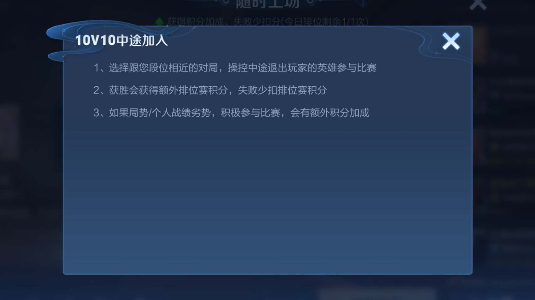 和5V5模式不同,10V10有一个独特的机制,那就是中途退出和中途加入。在这个模式中,玩家中途退出游戏只会被视为游戏失败,并不会受到挂机的惩罚。