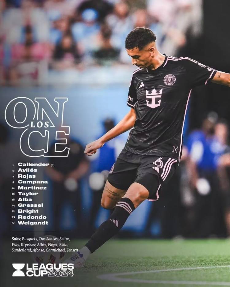 迈阿密国际首发:1-卡伦德、18-阿尔巴、14-赫克托-马丁内斯、6-阿维莱斯、57-马塞洛、55-小雷东多、42-扬尼克、7-罗哈斯、16-泰勒、8-坎帕纳、24-朱利安