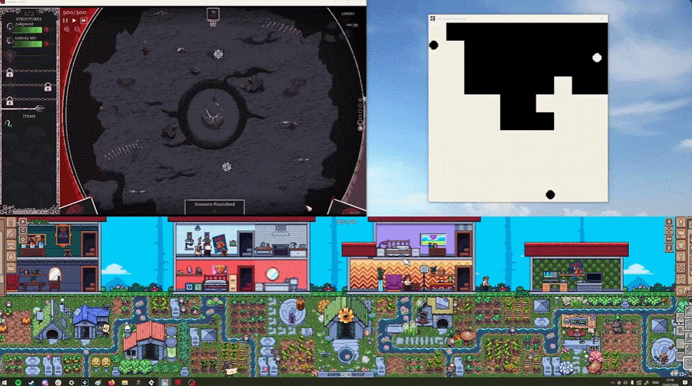5. 同时玩多少游戏才算多?以后游戏玩家可能也要进入“监控室老大爷”时代了。图中游戏分别为《异端尖叉》、《Yin-Yang Ping-Pong》(8 月 6 日发售)、《My Little Life》(暂未发售)和《Rusty's Retirement》。