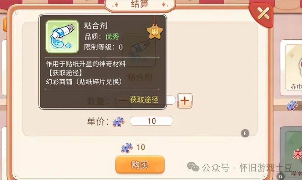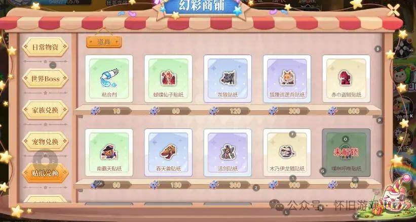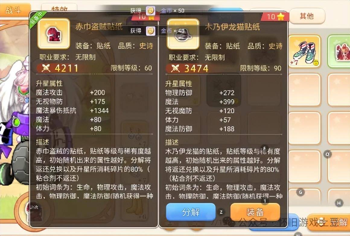 首先说贴纸。贴纸需要达到60级时开启,贴纸的初始属性随机,咱们可以通过升星来提升贴纸的初始属性,目前最多可以升级到10星,最多拥有5个词条属性。贴纸可以通过幻彩商铺使用贴纸碎片兑换获得,而贴纸碎片则可以打怪物入侵副本获得,同样贴纸碎片也可以兑换粘合剂来升星。