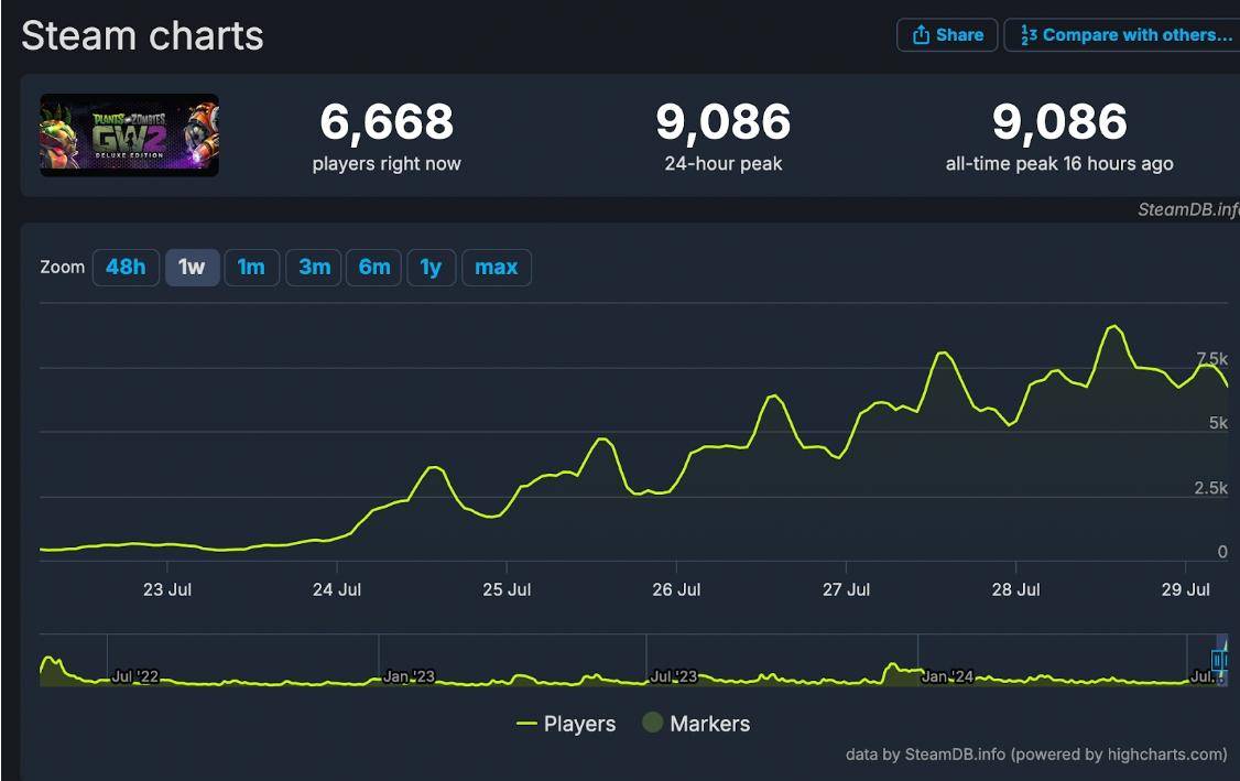 近日《植物大战僵尸:花园战争2》豪华版因为在Steam上推出了高达90%的折扣(售价15.8元),导致玩家数量显著增加。这种突然的价格下降无疑吸引了大量的新玩家和回归老玩家,但这种折扣能提升玩家的长期满意度和参与度吗?无论如何,与核弹一样,打折扣的游戏可以不玩,但不能没有!对吧?