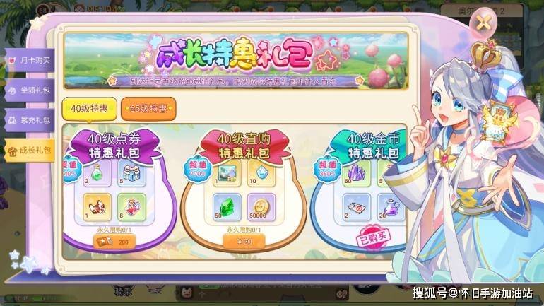 内容:到达指定等级解锁超值礼包,包含40/65级点劵礼包、40/65级直购礼包、40/65级特惠礼包;奖品特别丰富,0氪基本可以入手。