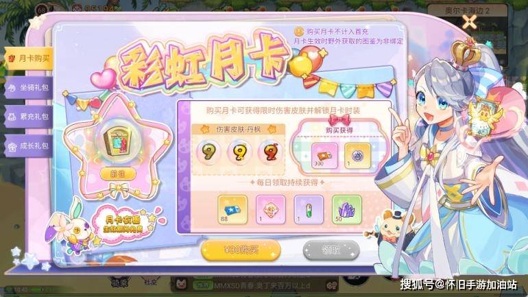彩虹月卡每天可以领取一定数量的绑定点券(绑点)、永恒之珠、双倍经验药水和强化石等;在月卡期间,月卡衣橱处于免费状态;甚至还能送伤害皮肤(丹枫)