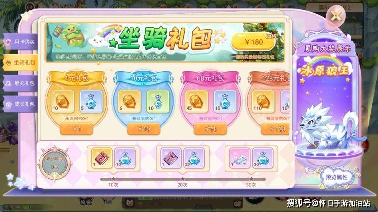 内容:充值会获得坐骑幻化石和坐骑经验药水,累计购买30次还能获得冰原狼王,提升大部分全能属性。长期玩家可以试试。
