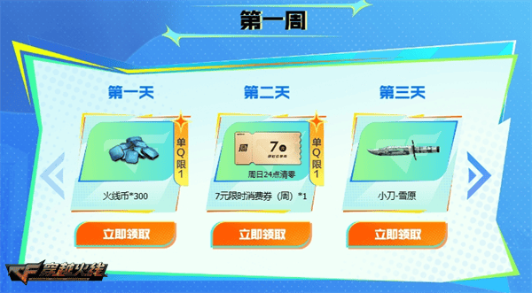 除限时消费券的特惠福利外,各位CFer每周进行游戏还可领取其他指定好礼,已签约用户在第一周游戏达到3天即可领取小刀-雪原,第二周达成游戏3天要求还有玫瑰手斧相赠,周周好礼相送!