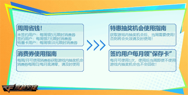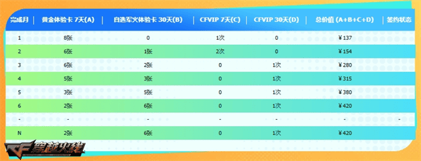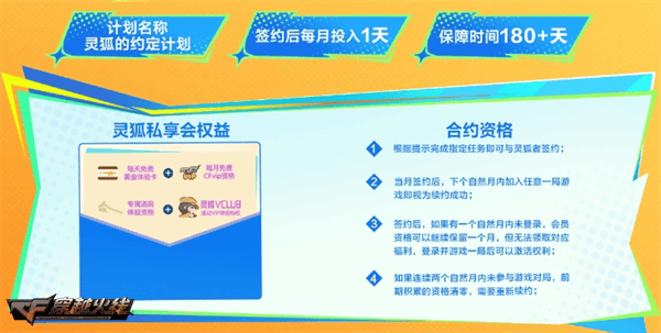 简而言之,各位CFer首次成功签约后仅需每月投入1天即可获取高达180天以上的权益保障,加入即有黄金体验卡与每月免费CFvip资格免费放送,还有专属道具体验资格与活动VIP体验特权相赠。